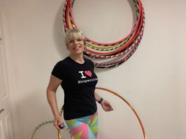 I was talking to a colleague about the pastimes we enjoyed doing as kids when we started reminiscing about hula hooping. I remembered what fun it was and how the hoop used to fly around my waist. I thought it would be fun to do it again and that it would probably be quite good exercise. Feeling motivated, I went to the local Decathlon store after work and bought a hula hoop. It was orange and skinny and not very big (I know now that it was the worst one I could have bought to relearn my childhood hooping skills)  I thought it would be easy but it wasn’t, I just couldn’t do it, the hoop repeatedly dropped  to the floor after half a turn.  I circled my hips, I wiggled from side to side but down it went. I kept at it but it just would not stay up (I know now that if I’d bought a bigger hoop it would have been much easier).  I didn’t want to let it get the better of me though because I used to be able to do it and was convinced I could do it again. I tried for over a week and then had the bright idea of doing it to music. Eventually Queen’s ‘Don’t Stop Me Now’ encouraged the hoop to whip round my waist several times before clunking to the floor. I was elated and realised then that this was the exercise for me. I carried on practicing and became more proficient (and a size 8!) as I hooped away in a small space between the television and the bookshelf. I constantly came between my husband and Star Trek and sent photos and ornaments clattering to the floor.  I joined a class for hoop dance which I loved (and still do although I’m not very good at it), but it was a bit slow and I wanted to hoop energetically, with other people to catchy tunes. I couldn’t find the classes to match what I wanted so I decided to do my own.  After training as an exercise instructor and devising some exercises with a hoop  to ‘70s and ‘80s  dance tunes. I started holding ‘Hoopercise’ classes at local community centres at the weekends.  Hula hooping is, without a doubt, the most fun you can have whilst exercising, after all, when was the last time you left the gym laughing?  Weighing myself every day and having a fitness tracker keeps me mindful of what I eat and how much I move but hula hooping keeps me at a size eight with the 25 inch waist I had in my twenties. Now the kids have flown the nest I persuaded my husband to make a hoop room out of the spare room (furniture out, hooks on the walls for hoops).  It’s a  small room but big enough to get a hoop jiggle on. With Covid having put paid to my weekly classes I’m currently in the process of devising some online hoop classes so watch this space.  In the meantime, here are some tips for exercising with a hoop.